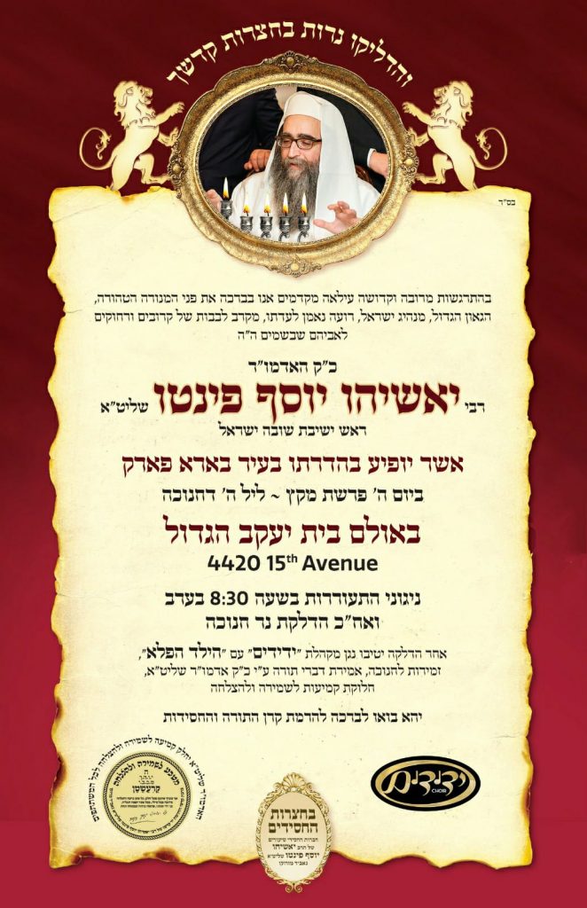 חסידי ותלמידי האדמו"ר רבי יאשיהו פינטו שליט"א, נערכים למעמד ענק, שיתקיים באולם ענק ב"בורו פארק", ובו הדלקת נר חמישי של חנוכה, שיעור תורה וחלוקת מטבע שמירה וברכה.