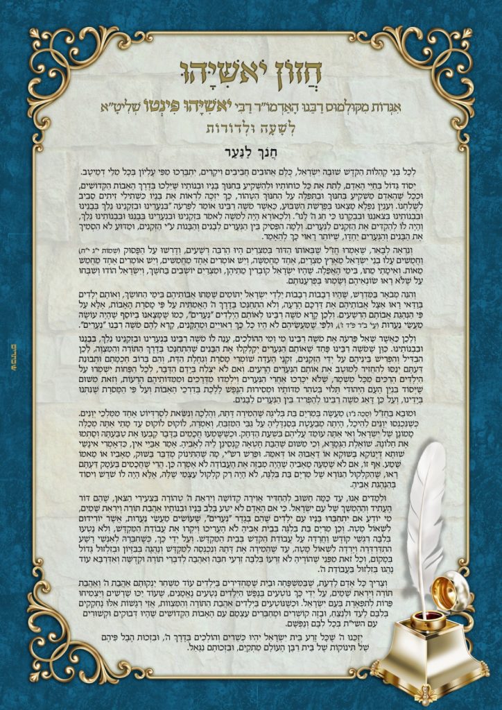 וְצָרִיךְ כָּל אָדָם לָדַעַת, שֶׁבַּמִּשְׁפָּחָה וּבַיִת שֶׁמַּחְדִּירִים בַּיְּלָדִים עוֹד מִשַּׁחַר יַנְקוּתָם אַהֲבַת ה' וְאַהֲבַת תּוֹרָה וְיִרְאַת שָׁמַיִם, עַל יְדֵי כָּךְ נוֹטְעִים בְּנֶפֶשׁ הַיְּלָדִים נְטָעִים נֶאֱמָנִים, שֶׁעוֹד יַכּוּ שָׁרָשִׁים וְיַצְמִיחוּ פֵּרוֹת לְתִפְאֶרֶת בְּעַם יִשְׂרָאֵל. וּכְשֶׁנּוֹטְעִים בַּיְּלָדִים אַהֲבַת הַתּוֹרָה וְהַמִּצְווֹת, אֲזַי רְגָשׁוֹת אֵלּוּ נֶחְקָקִים בְּלִבָּם לָעַד וּלְנַצֵּחַ, וּבָזֶה קוֹשְׁרִים וּמְחַבְּרִים עַצְמָם עִם הָאָבוֹת הַקְּדוֹשִׁים שֶׁהָיוּ דְּבוּקִים וּקְשׁוּרִים עִם השי"ת בְּכָל לִבָּם וְנַפְשָׁם.  יְזַכֵּנוּ ה' שֶׁכָּל זֶרַע בֵּית יִשְׂרָאֵל יִהְיוּ כְּשֵׁרִים וְהוֹלְכִים בְּדֶרֶךְ ה', וּבִזְכוּת הֶבֶל פִּיהֶם  שֶׁל תִּינוֹקוֹת שֶׁל בֵּית רַבָּן הָעוֹלָם מִתְקַיֵּם, וּבִזְכוּתָם נִגָּאֵ