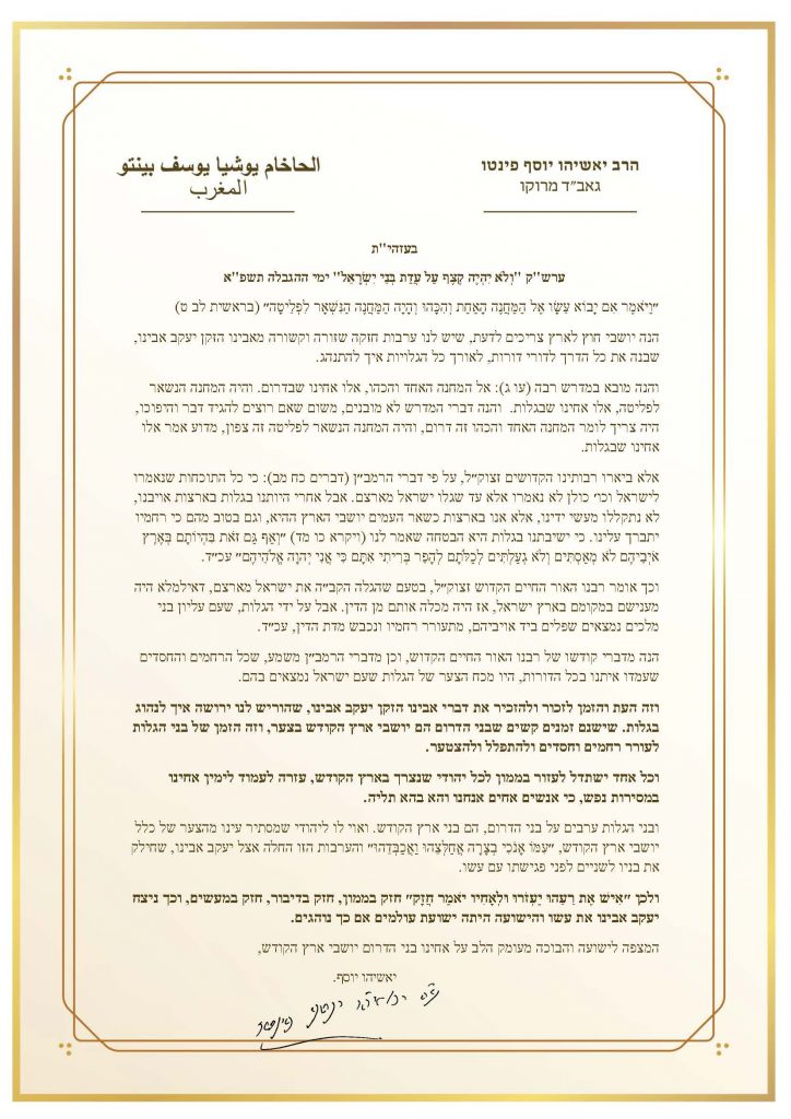 כך כותב רבה שלמרוקו האדמו"ר רבי יאשיהו פינטו שליט"א באגרות ששלח השבוע לתלמידיו בכל רחבי תבל, בהם מדגיש ראב"ד מרוקו את קושי השעה, והחובה המוטלת על כל אדם בשעות קשות אלו.