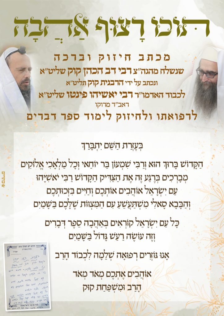 ברכותיהם של עשרות גדולי תורה, רבנים אדמורי"ם ופוסקי הלכה, שמחזקים את נושא לימוד ה"ספר דברים", הביאו את שלל המקורות של הסגולה המיוחדת, וכוחה, שמועילה לישועת הכלל והפרט,