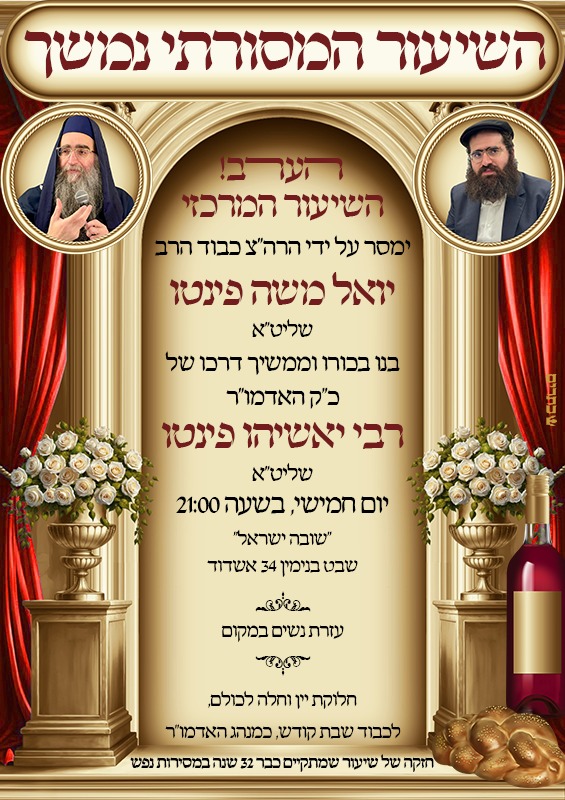 השיעור ימסר מבנם של קדושים הרה״צ כבוד הרב יואל משה פינטו שליט״א. בישיבת ״שובה ישראל״ • הערב שעה 21:00 רחוב שבט בנימין 34 אשדוד • א' חשון (23/10/25)