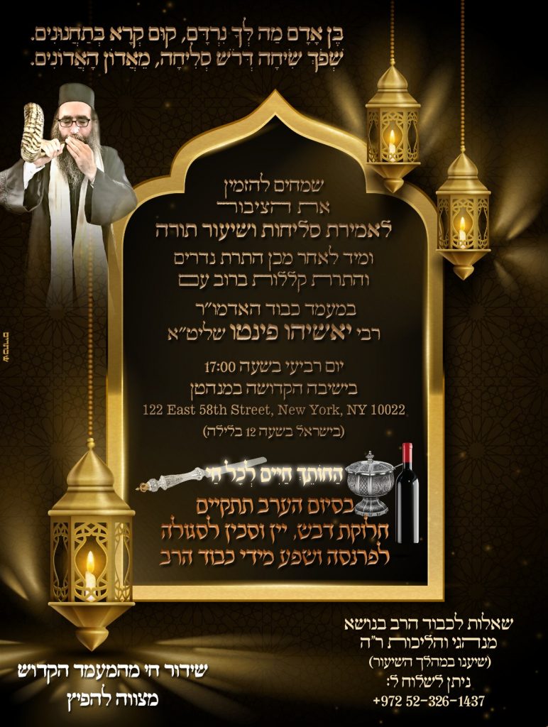 היום יום רביעי כ"ד באלול יתקיים מעמד לאמירת סליחות וחלוקת דבש ויין ושיעור תורה ומיד לאחר מכן התרת נדרים וקללות ברוב עם. במעמד כבוד האדמו״ר רבי יאשיהו פינטו שליט״א