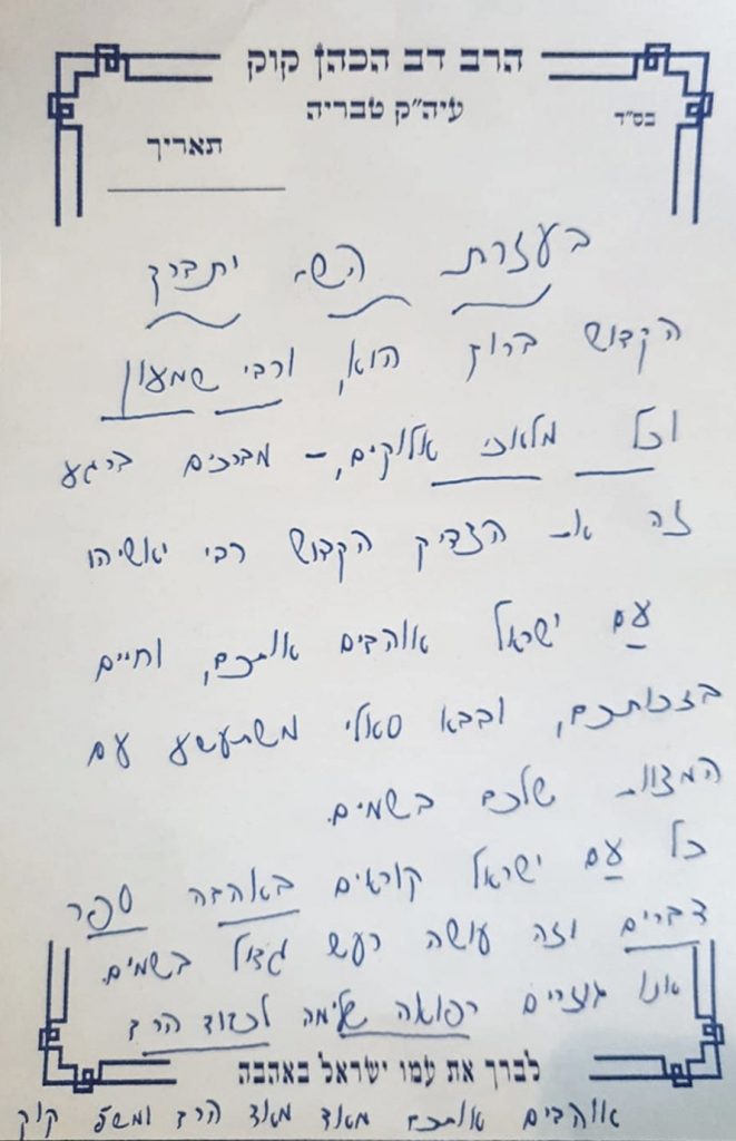 מכתב מיוחד שנשלח מהגה"צ רבי דב קוק, ונכתב בכתב ידה של הרבנית קוק שתחיה לכבוד האדמו"ר רבי יאשיהו פינטו שליט"א, ראב"ד מרוקו