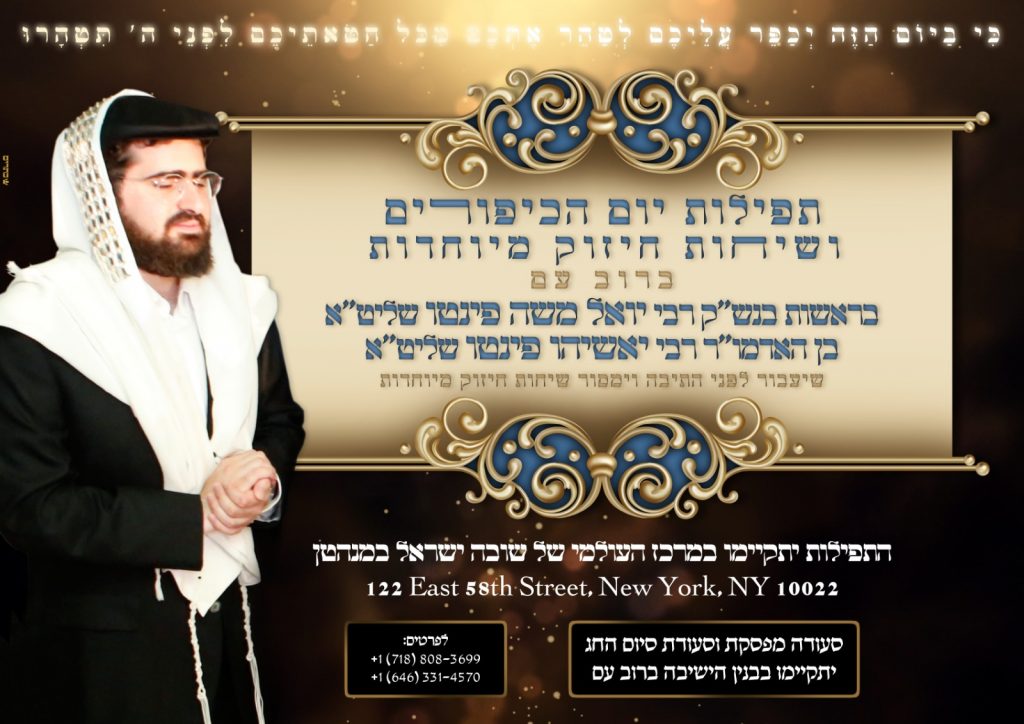 מאות מתפללים צפויים להגיע לתפילות יום הכיפורים במרכז "שובה ישראל במנהטן, בתפילות שיערכו על ידי הרה"צ רבי יואל משה פינטו שליט"א, שיעבור לפני התיבה, וימסור את שיחות החיזוק המיוחדות במהלך יום הכיפורים.